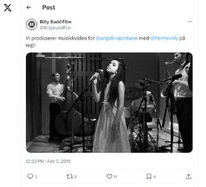 The claim that the black-and-white music video for "I Put a Spell on You" was recorded on or before 2015-02-03 is based on a Twitter post made on that date by the production company Billy Budd Film which contained a picture of Angelina and the band members on the set of the music video, and stated (translated from Norwegian): "We produce music videos for @angelinajordanA with direction by @PerHeimly!".[8]